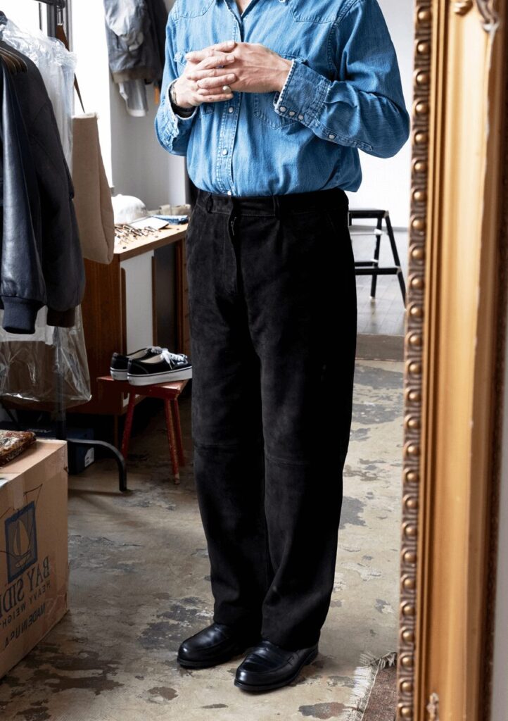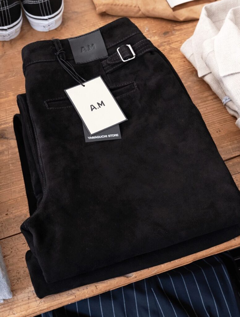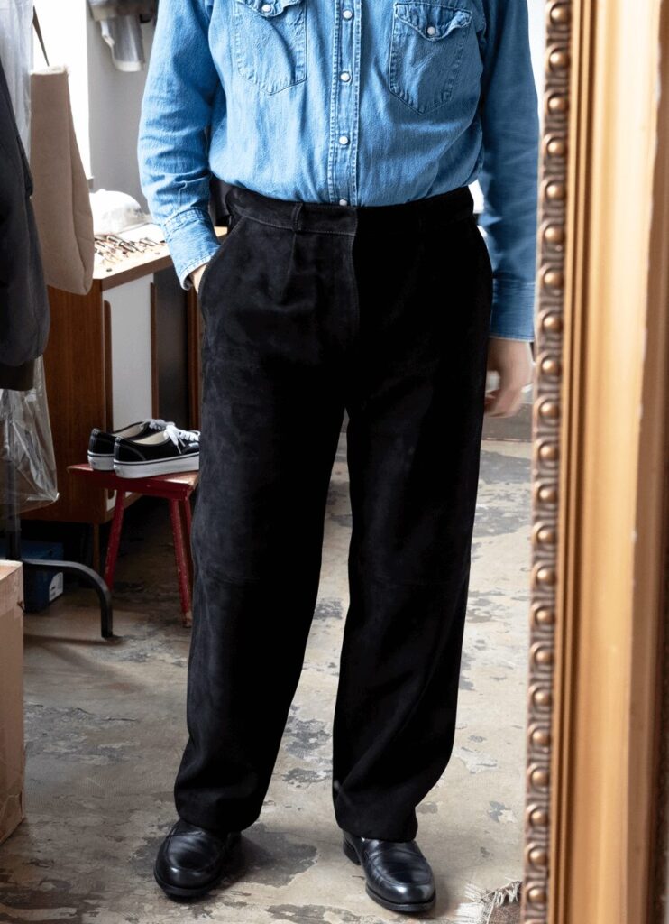 アジャスター&ワンタックシルエットのドレッシーさと、艶めきを放つ毛並みのエレガントさ、そんな大人な印象に加えてレザーアイテムの持つROCKな骨っぽさを ちゃんと感じる他には無いSUEDE TROUSERS。