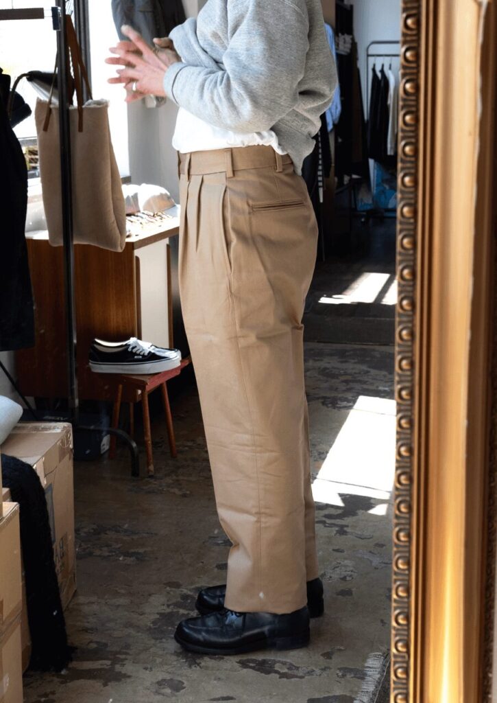 RELAXED FITと言ってもラルフローレンチノetc.のようなワイドシルエットではなく、”2タックテーパードチノ” と呼ぶのがふさわしいスッキリめのシルエット。