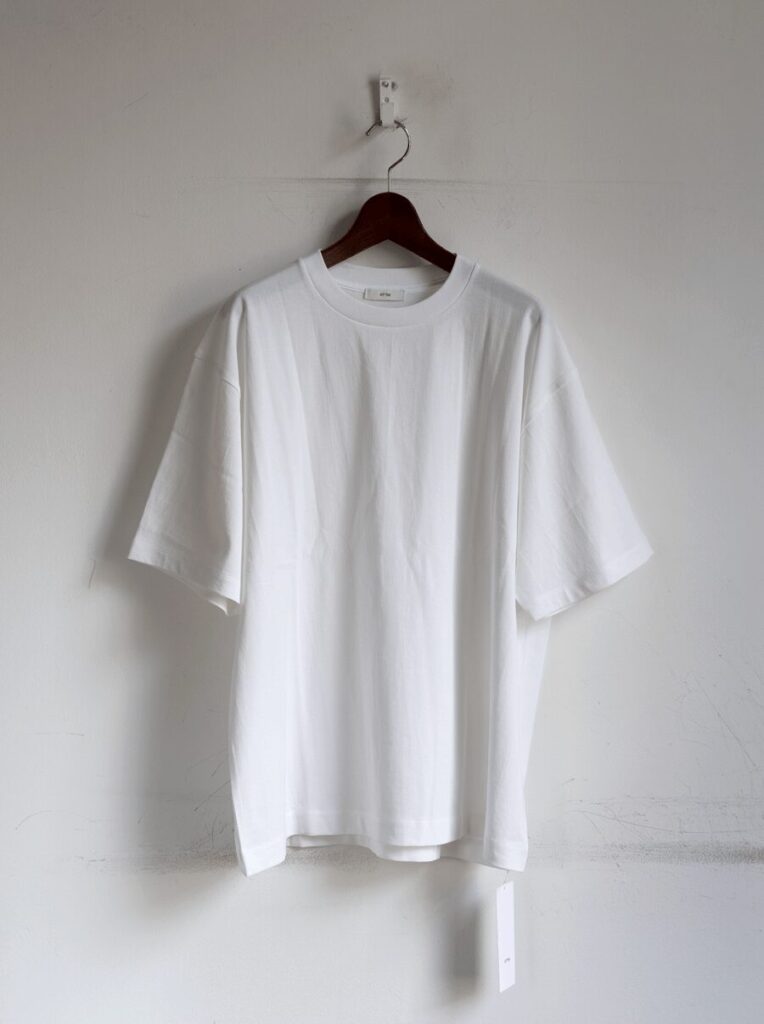 ややオーバーサイズな、ボックスシルエットが特徴のTシャツ。肉厚な素材なので白の透けも気になりません。首元はフライスでしっかり詰まっており、すっきりとした印象です。