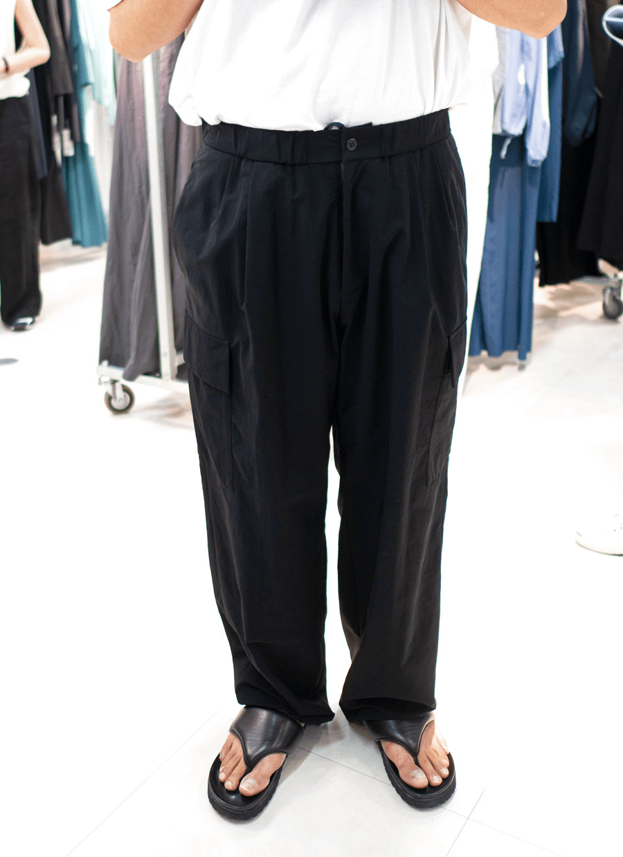 ヒップにボリュームをもたした、パラシュートのような丸みのあるシルエットが特徴のカーゴパンツ。ウエストゴム仕様で、ベルト内側に紐が通っているので、表に紐を出さず調節し、着用可能です。シワになりづらいので持ち運びにも便利で、速乾性もありイージーケアです。