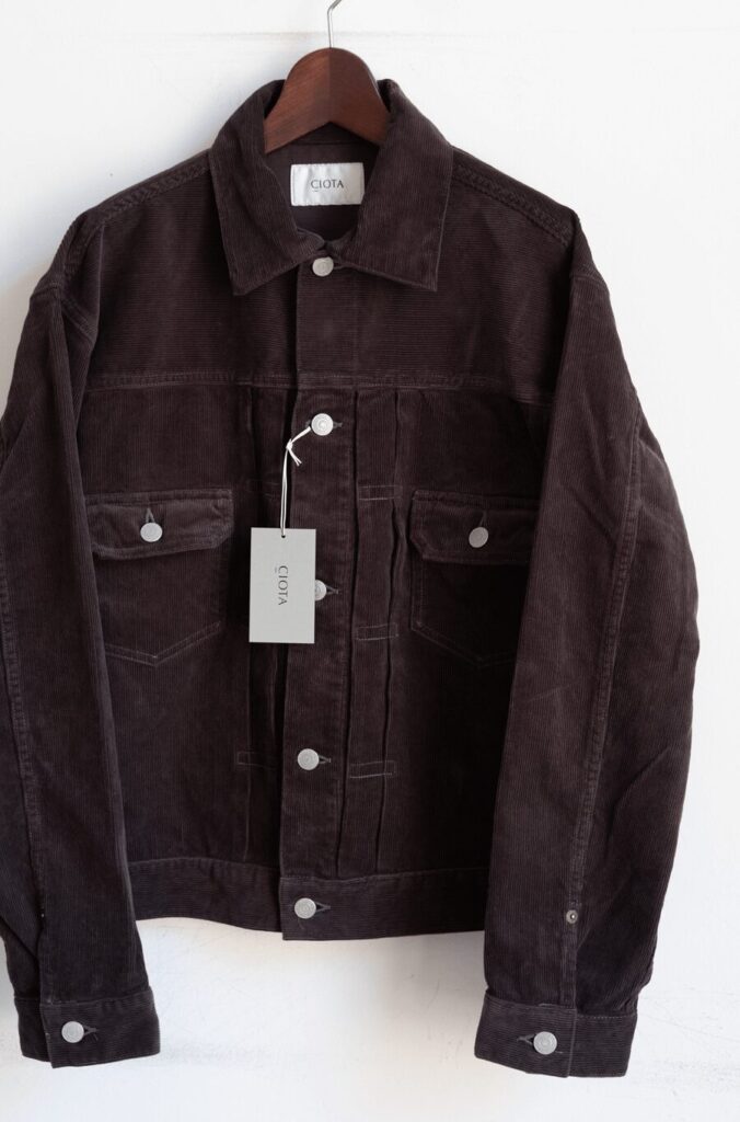 CIOTAの定番デニムジャケット、Double Pocket Jacketをコーデュロイ素材で製作。両胸のフラップ付きポケット、フロントプリーツといったディテールは、1950年代のヴィンテージからサンプリング。着やすさを考慮し、ヴィンテージモデルよりもやや着丈を長く、アームホールを大きくしています。コーデュロイはもちろんスビンコットンで作ったオリジナル。ソフトな起毛、美しい光沢と畝、ヴィンテージのような風合いが魅力です。