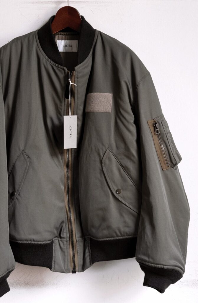静かな光沢を放つラギッドな素材、ビンテージMA-1を彷彿させる質実剛健で繊細な縫製、そこにCIOTAのビンテージアイテムに対する洞察力と展開力がプラスされて、見た事のないクリーンなビンテージ感が溢れるフライトジャケットが出来上がっています。