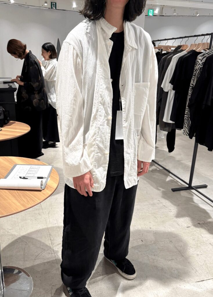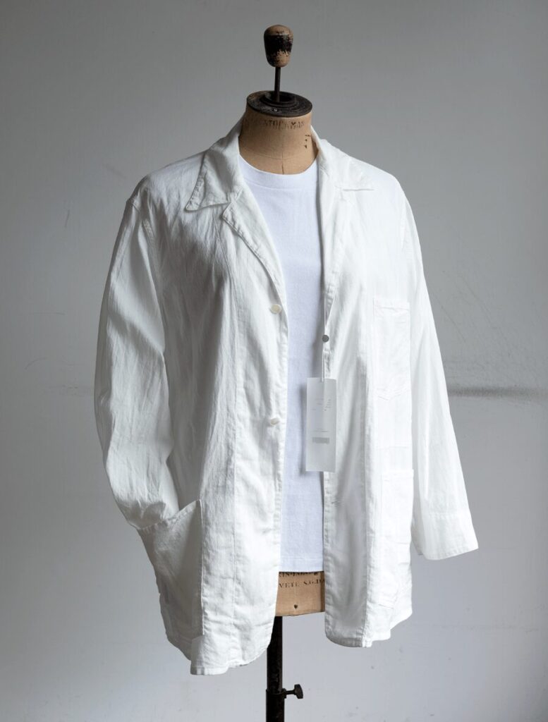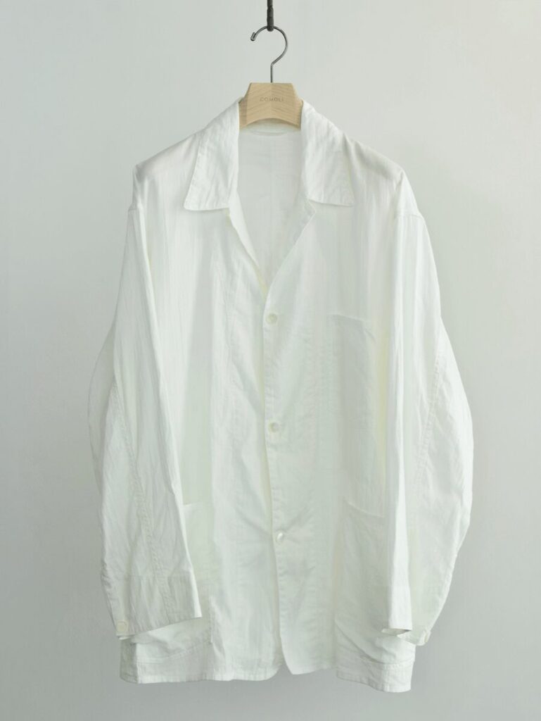 薄手で程よいハリが有りカリッとドライなタッチな生地が、暑い時期に抜群に快適なCOMOLIの夏の継続素材 コットンを空気紡績したオックスフォード生地。堅過ぎない1938型とホワイトの発色の相性も絶妙です。