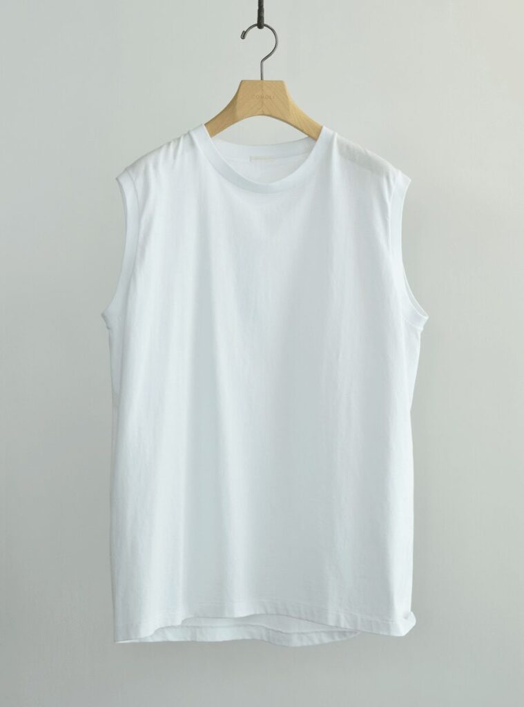 薄くなく厚すぎないウェイトと空紡コットンのドライタッチな素材で作られた COMOLI コットンジャージ ノースリーブ。気になる半袖インナー使いの袖のかさばりを解消してくれます。そして1枚でも開放感のあるタウンウェアとして、タンクトップでは気恥ずかしいシチュエーションで活躍間違いなしのコットンジャージ ノースリーブ。