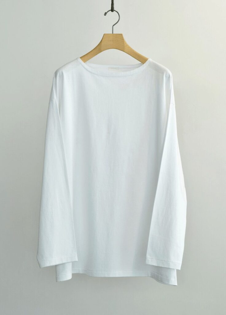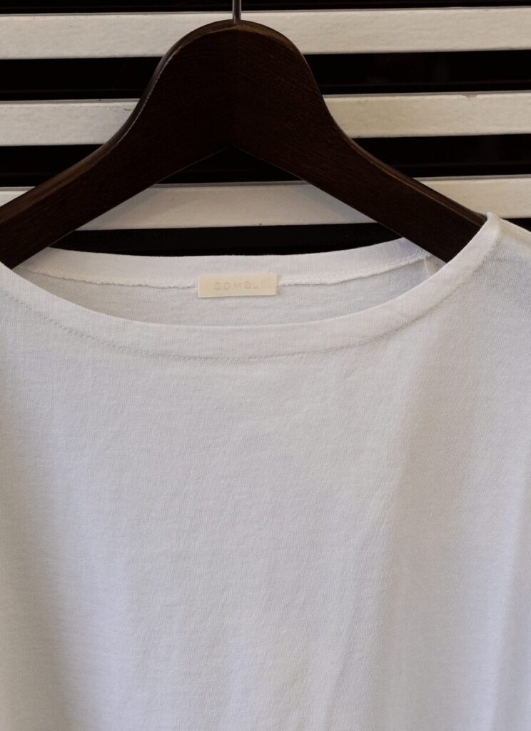 2000年位以前のアメリカ製Tシャツのカラッとした素材感をモチーフに現代化しているCOMOLIのコットンジャージ。厚過ぎず程よいコシと凹凸感が有ってドライで肌離れの良い、ルックスと機能性を兼ね備えた着ると納得、男性支持者の多い素材です。フレンチバスクシャツタイプのボートネックも、シャツ替わりにコーディネートしてもサマになる、無骨さと大人なエレガント&リラックスのバランスが絶妙です。