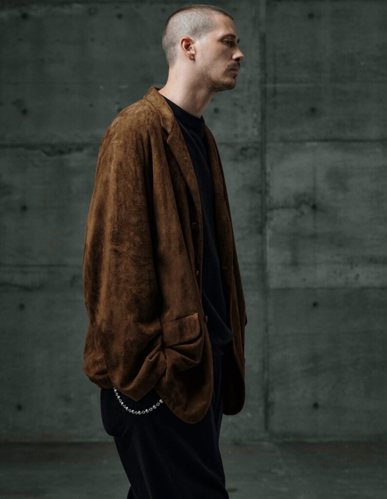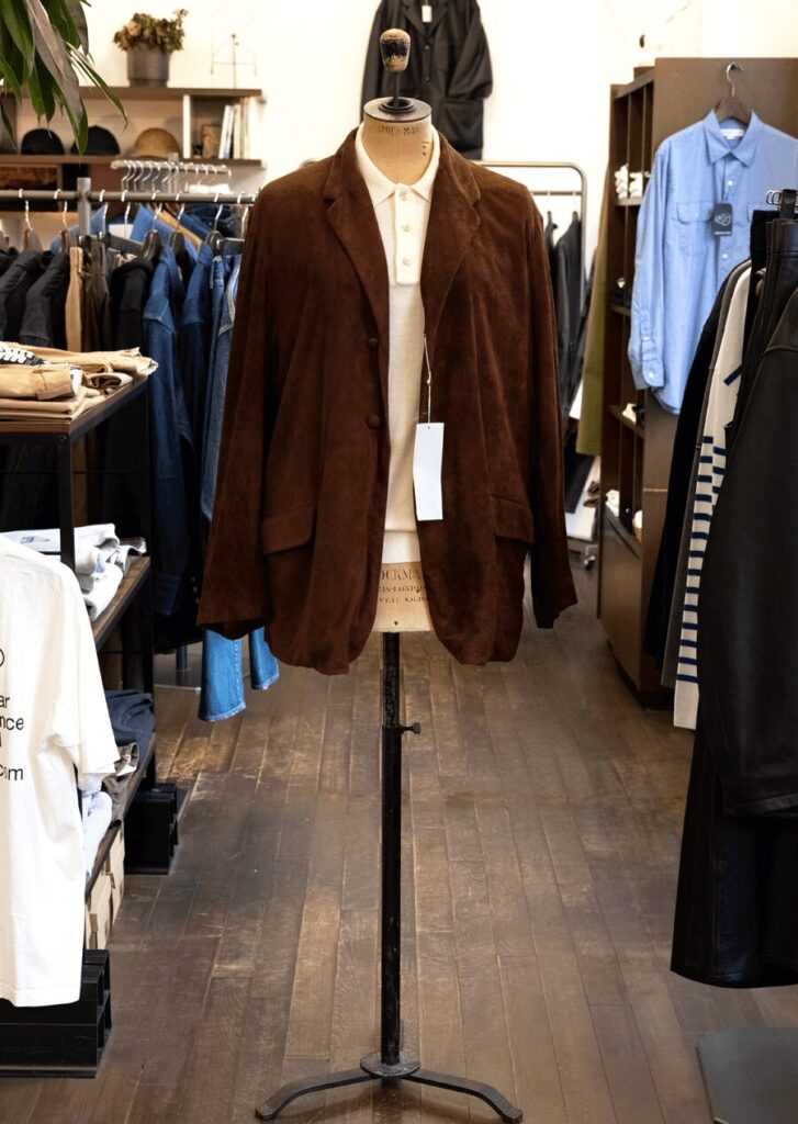 柔らかくしなやかでとても上質な佇まいと同時に、野生味のある味わいを感じさせるBROWN SUEDE。美しいドレープが活きる絞りの少ないカバーオール型のジャケット。旅先で奮発して買い求めたような、何気なくて作家不明のアノニマスな感じが良いんです。