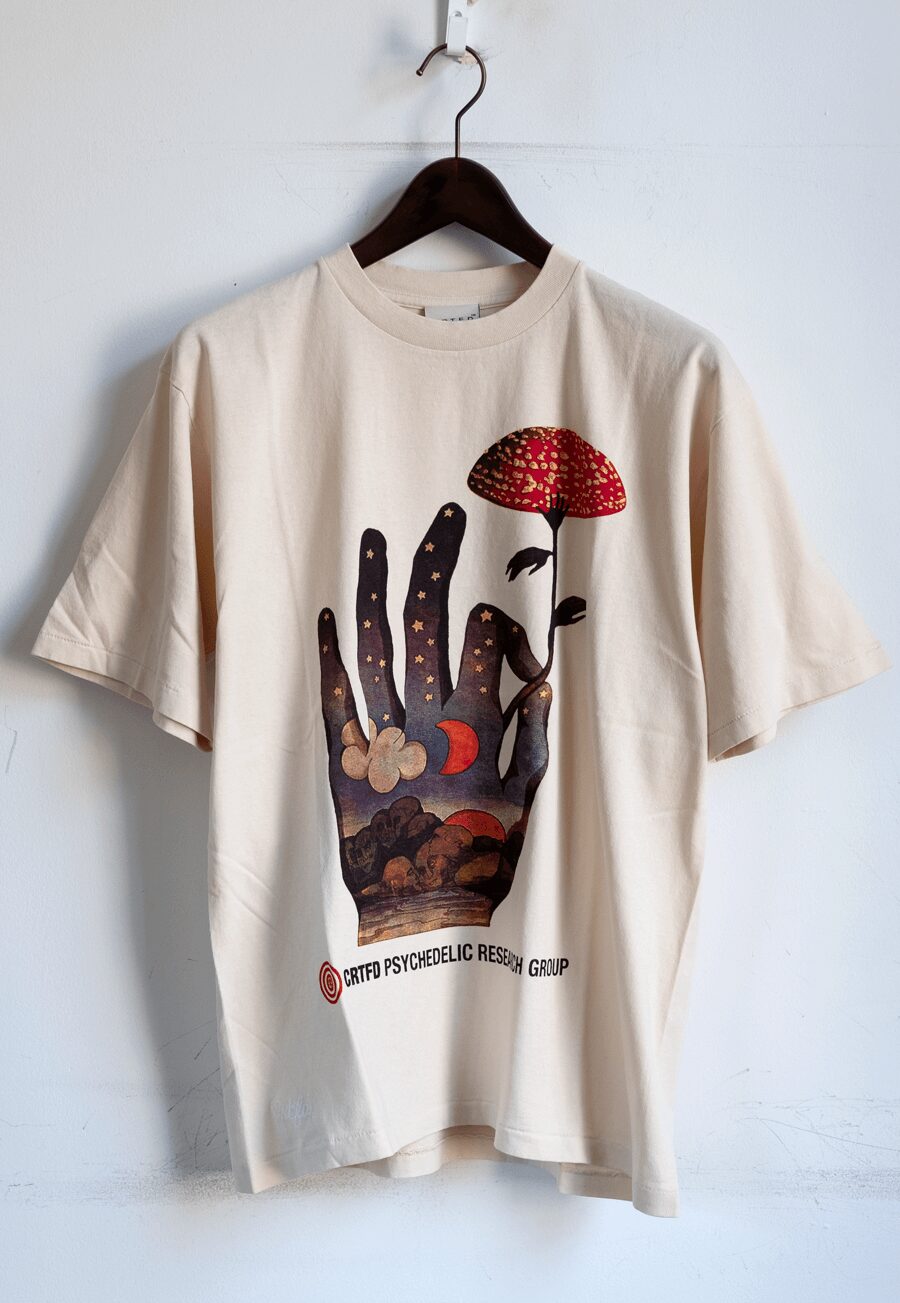 幸福を呼ぶとも言われる毒キノコ ベニテングダケがモチーフのTシャツ。Tシャツでストーリーを感じさせる深みと圧倒的に仕上がったグラフィックが素敵です。ジャンルやジェンダーを飛び越えて着て欲しいTシャツ。