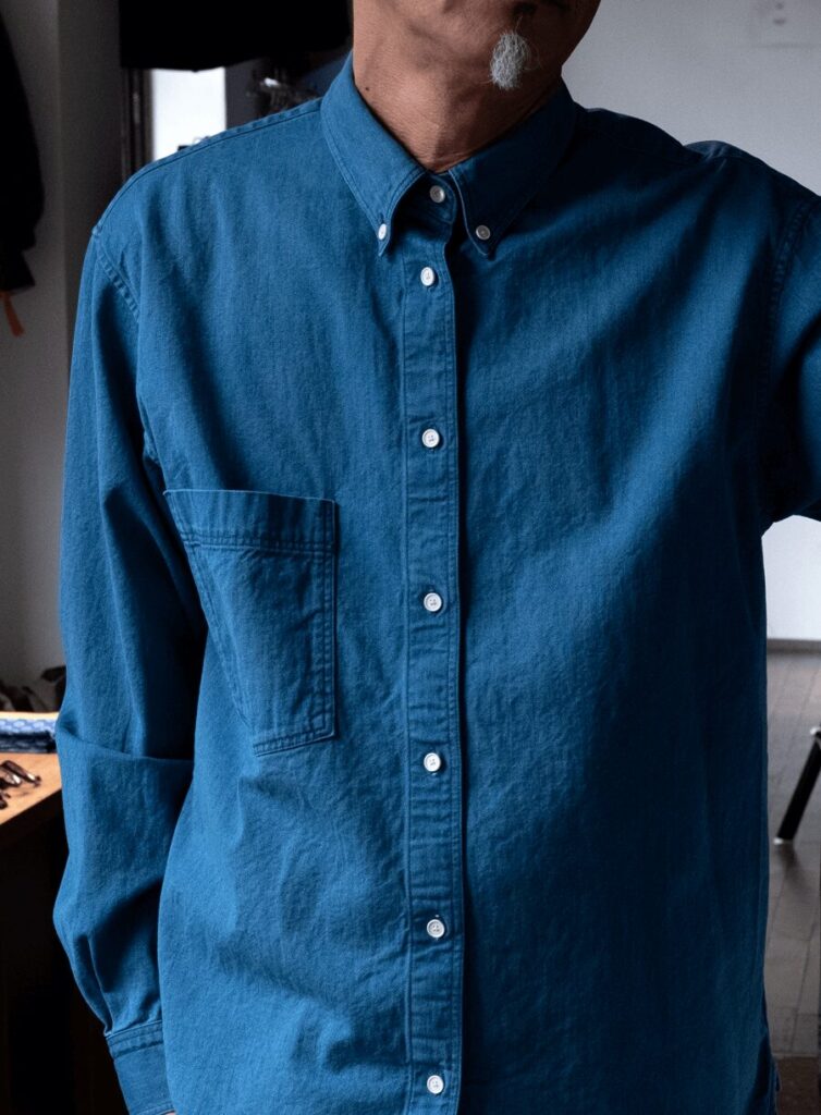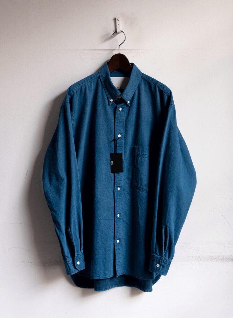 ES:Sからヨーロッパの古いデニムを使ったというB.D SHIRT。Errico Formicolaとはまた違う、閉めても良し,開けても良し, なミニマルなロールを描くB.D.とVINTAGE DENIMが相性バッチリ、ワンウォッシュも選べましたがこのユーズドウオッシュが尚良かった。中肉8ozデニムのインナーでも1枚でもOK!! なウェイトで、モダンなRALPH LAUREN感の着回しが最高です。