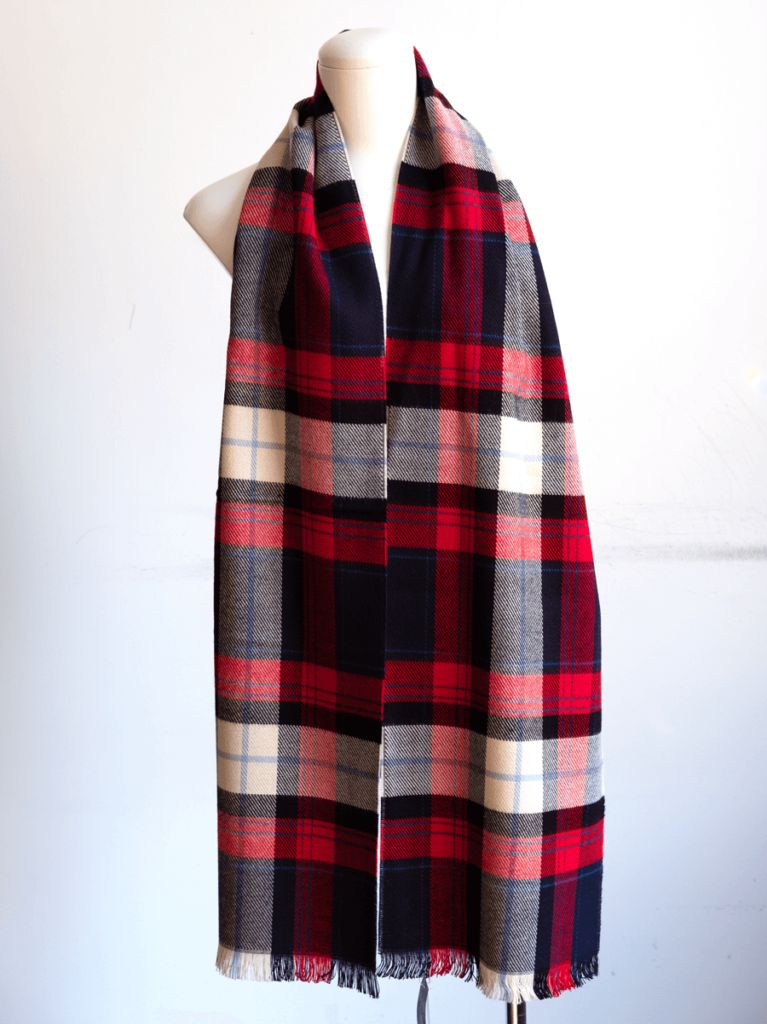 29cm×200cmと横幅がコンパクトでアクリル100%のクッキリしたチェックがフレッシュな印象のマフラー。