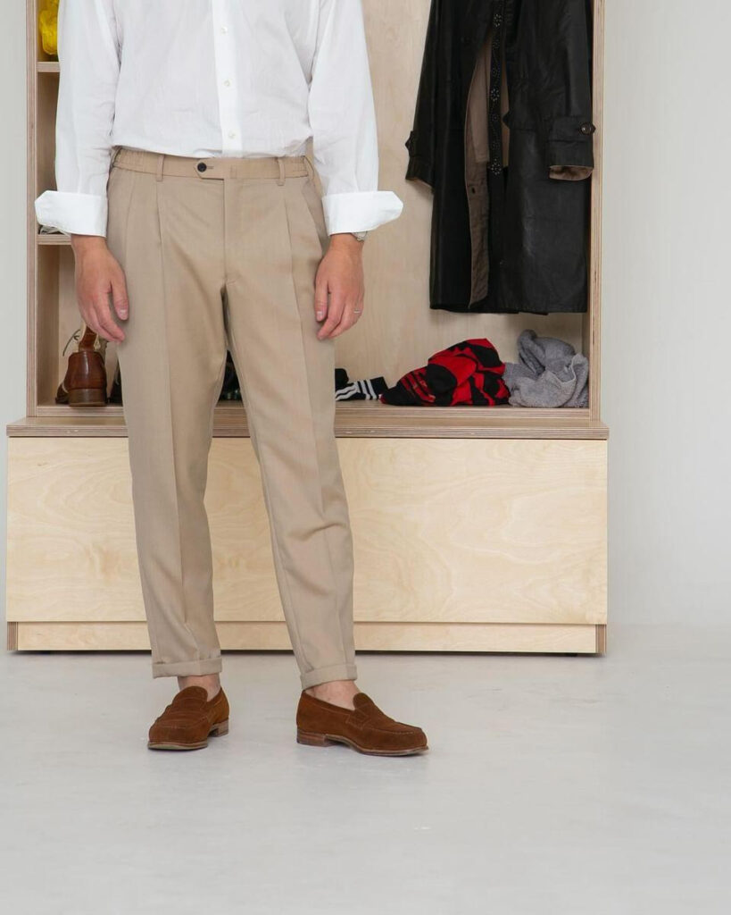 ウエストはシャーリング仕様で、内側にはドローコードを施したコンフォートなスラックス。