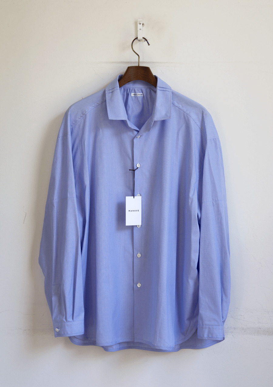 MANAVEの代表モデル Tuck Collar Shirtsは色表記ではSAXとなっていますが、青白の縦糸,横糸の畝がストライプに見える繊細で渋〜いセンスの表情。