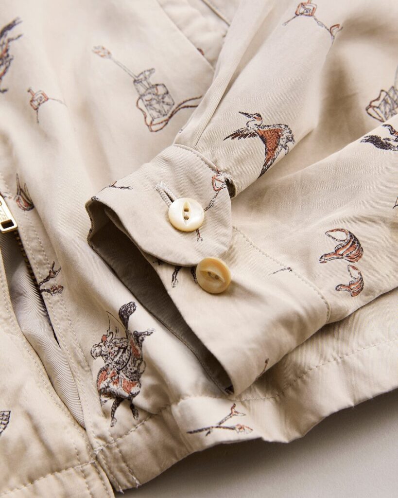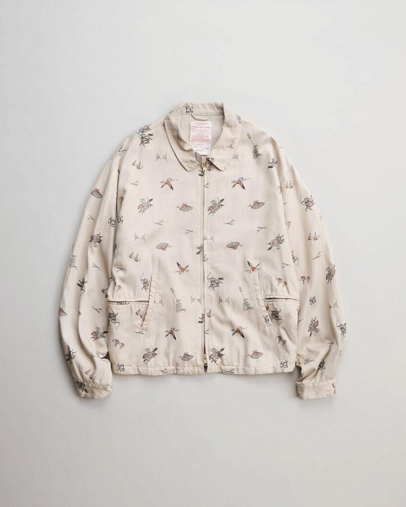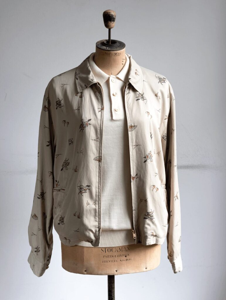 北陸産地のレーヨンコットンギャバジンに 流鏑馬とカウボーイと言うクロスオーバーモチーフを、京都の特殊染め工場で印刷したスポーツジャケット“C.MAXIM”。