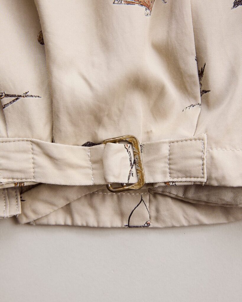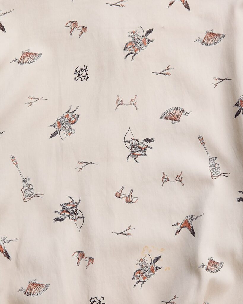 生地は北陸産地のギャバジンを京都町工場で可抜染め→抜染→着色抜染プリントを施しています。柄は”流鏑馬”と”カウボーイ”という異文化の騎乗武芸を重ね合わせたモチーフ。弓矢や和鞍・扇子・鶴など祝祭武芸の記号を散りばめ3色シルクスクリーンで表現。