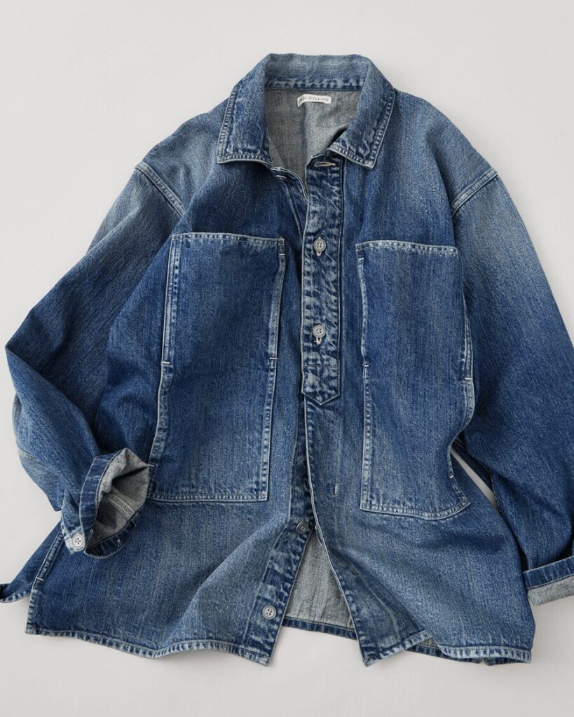 高品質な米綿を使用した12oz白耳セルビッチデニムジャケット。1920年代〜30年代の 米国陸軍のデニムプルオーバーをリファレンスとし、ポケットやフロントオープンの 仕様をアップデートさせブルゾンライクに羽織れるよう仕立てたデザインです。生地 はシャトル織機で丁寧に織り上げた肉厚過ぎず軽過ぎない柔らかく着心地が良い仕上 がり。着用を重ねたようなヴィンテージ感のあるタテ落ちを表現するため職人による 製品加工を施しています。