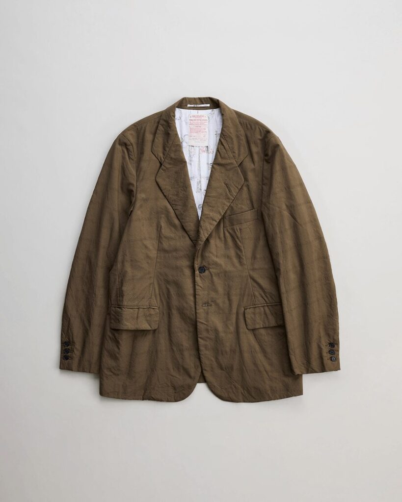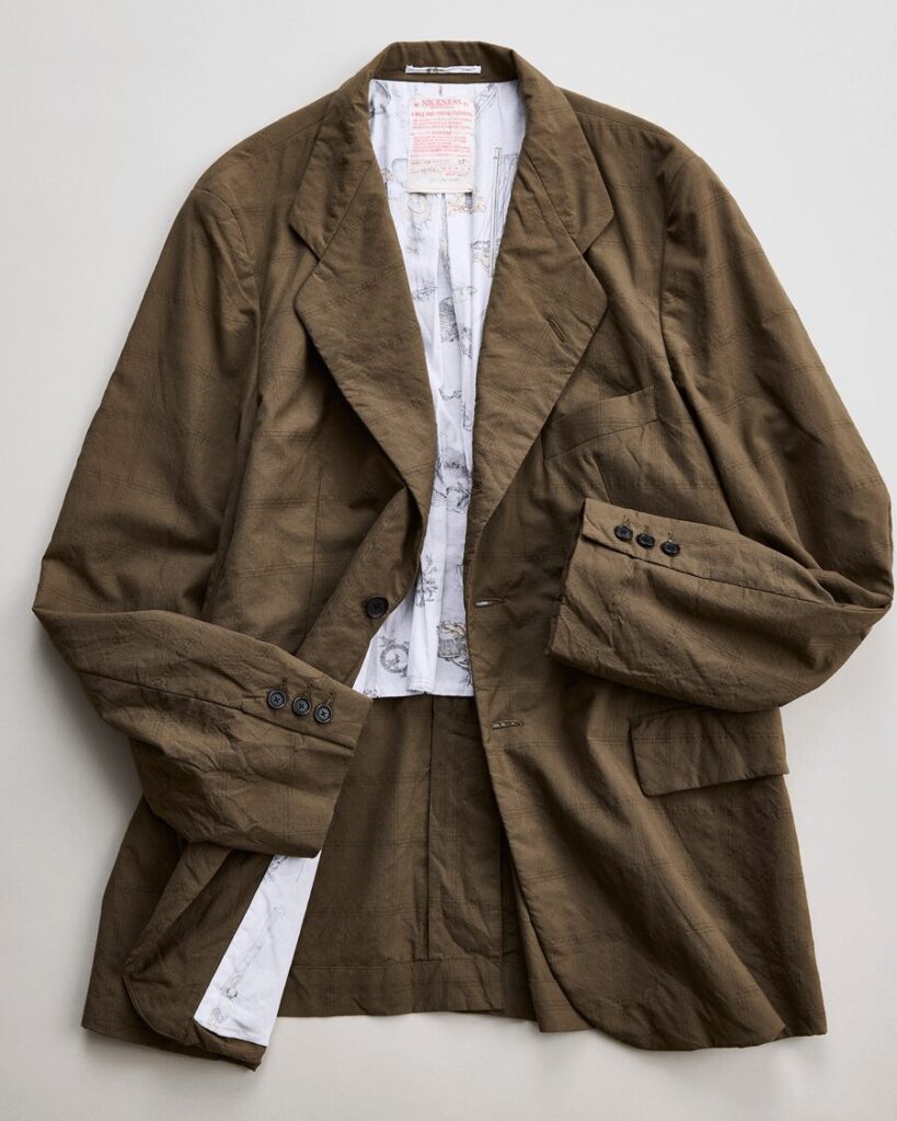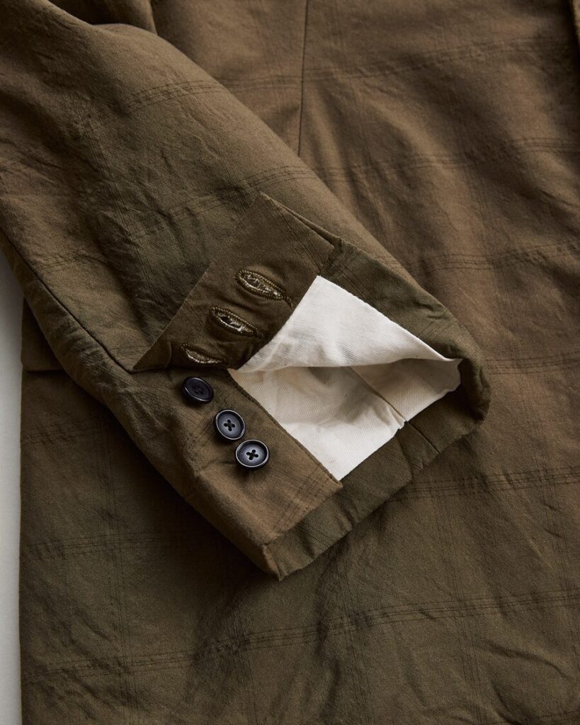 細番手のメリノウール平織り地に撚り方向を変えた装飾糸を加えた生地で製作したクローバーリーフテーラードジャケット。型は1950年代〜60年代のイタリアン・ビスポークジャケットをリファレンスに、直線的な男性的構造と柔らかな曲線が同居するよう再構築。粗野なムードの中にSuper100’s原料ならではの上質さを内包したギャップある表情が魅力です。柄にはあえて大柄のウィンドウペーンを配し立体的な素材感を際立たせています。日本の伝統色「鶯茶」を基調に染め上げ、静けさと奥行きを纏う佇まいを表現。裏地はオリジナルの北斎漫画柄を採用しています。