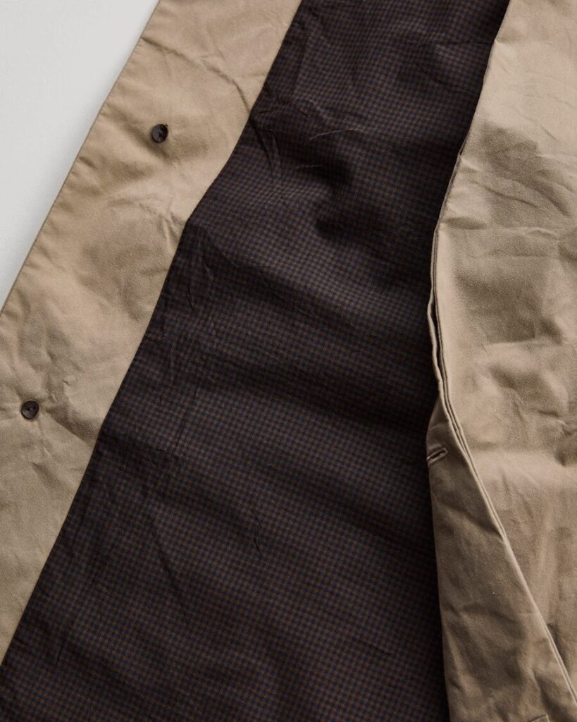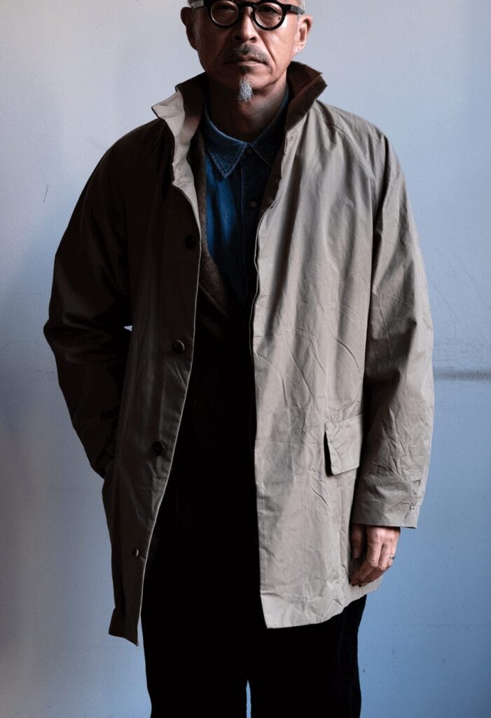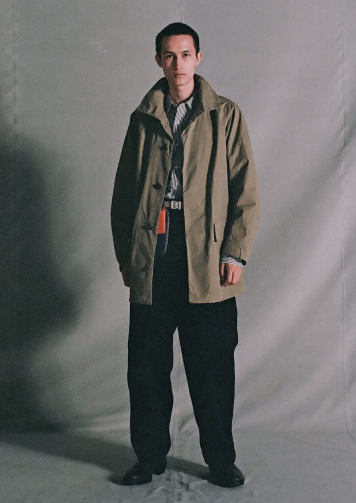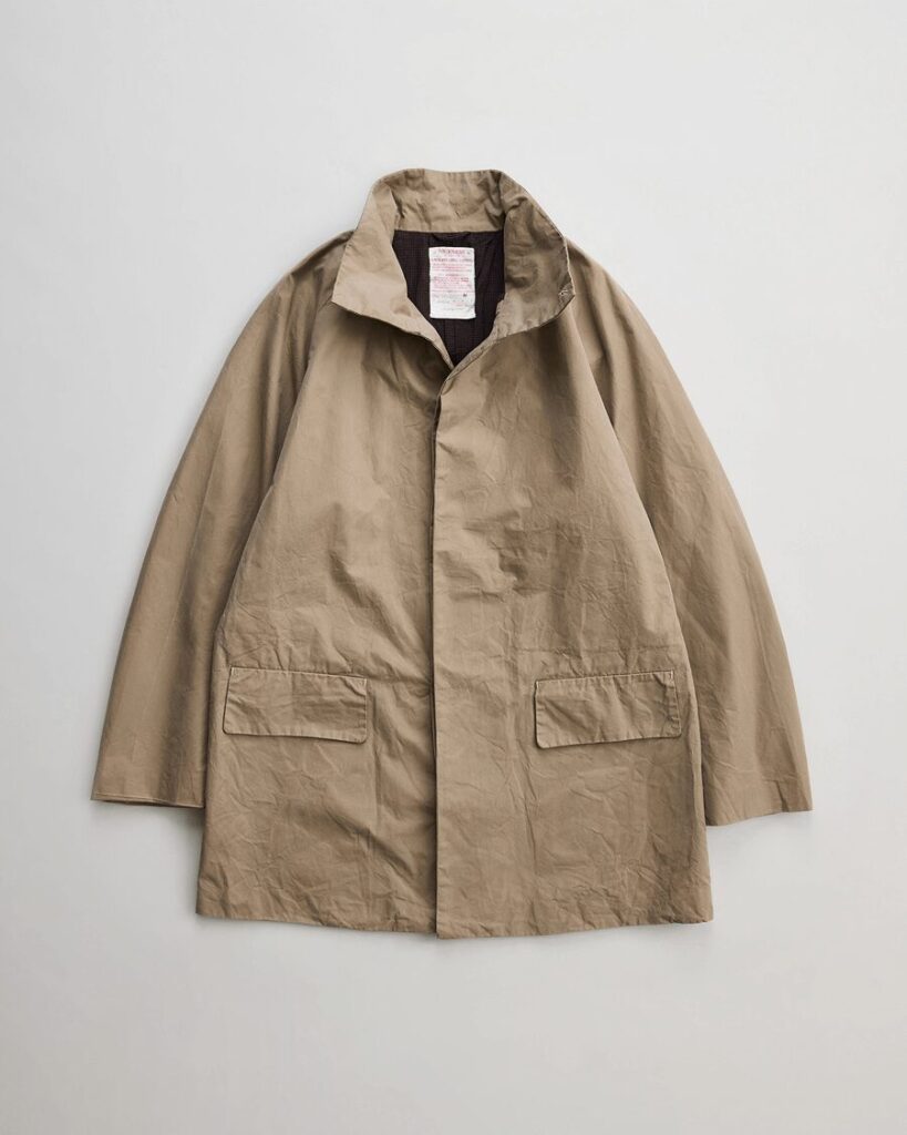 細番手の超⻑綿双糸を限界まで高密度に打ち込んだ先染め生地で製作したローバーコート。クラシックなブリティッシュミリタリー構造を踏襲しつつ現代的視点で再構築。生地は1950年代〜60年代の軍用マックコートに着想を得て、イギリス軍の防水ベンタイル素材をリファレンスとしています。綿100%で耐水圧900mmを誇り、天然の高性能撥水加工を実現。サイドにはパンツポケットへのアクセスを容易にする“アクセスベンツ”仕様を設け、ミリタリーアイテムらしい実用性も。都市と自然、ドレスとワーク、伝統と革新という対極の価値観を静かに宿すコートです。