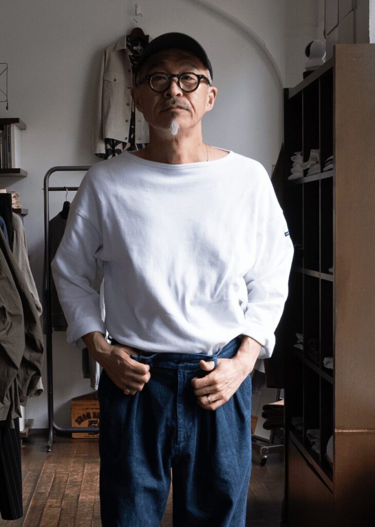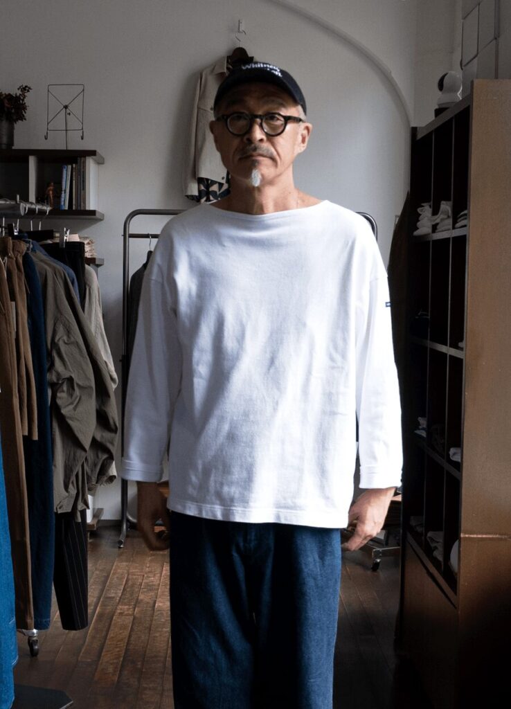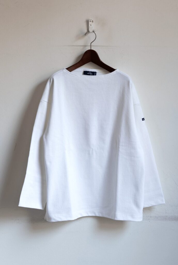 またOUESSANTの風合いと白の相性で産まれる、男らしくクリーンな生地の表情と、ボートネックの丁度良い開きによる色気や上着を羽織った時のニュアンスのある首元の雰囲気も素晴らしい。