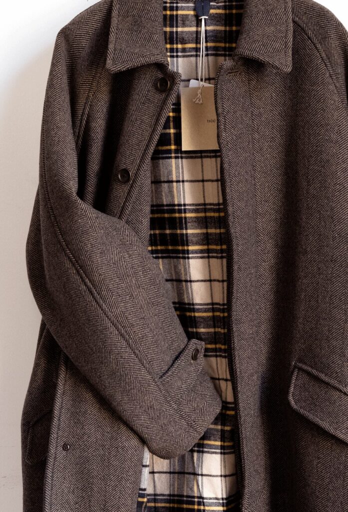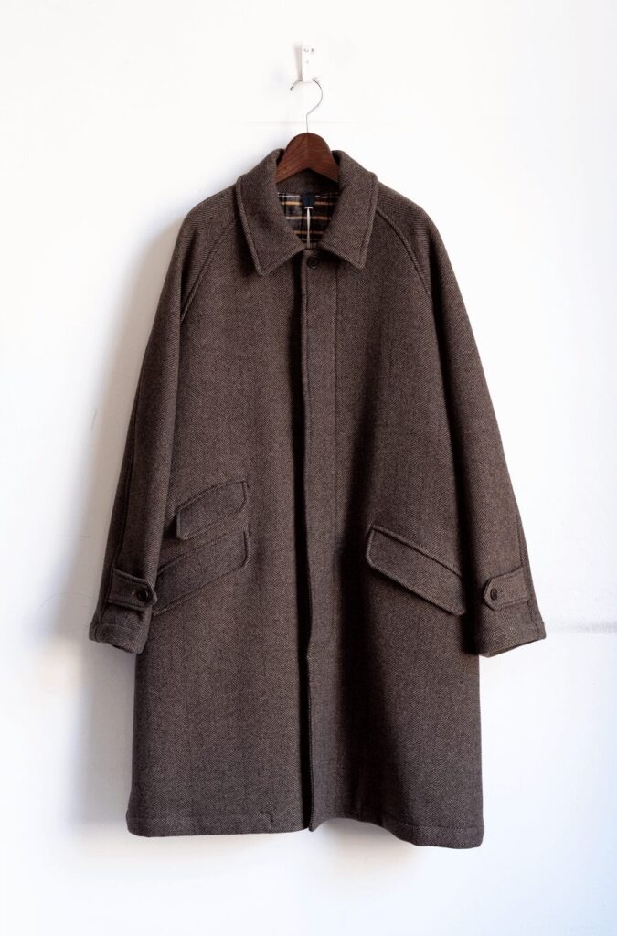 LININGのタータンチェックとのイナたい相性も素晴らしい、COATらしいボリュームがテンションを揚げてくれるHerringbone Raglan Sleeve Coat。