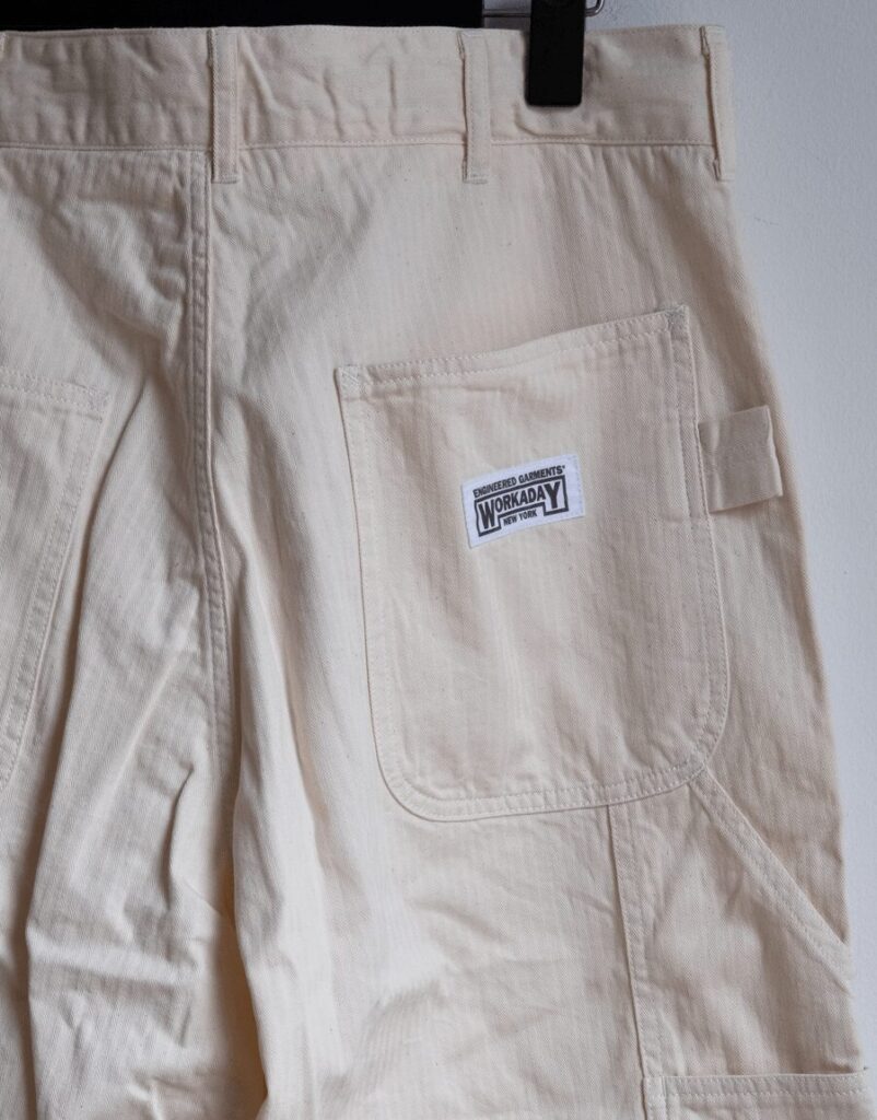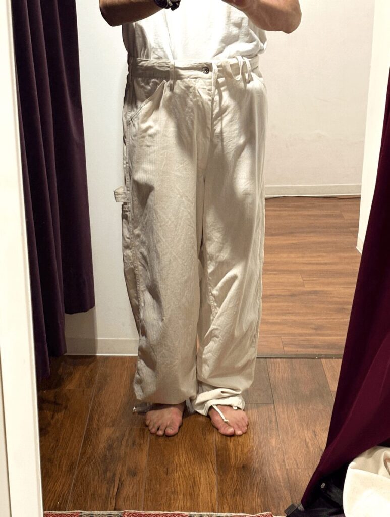 股上が深くワイドで絞りの少ない、バタ臭く美しいフォルムが売りのWORKADAYのペインターパンツ。