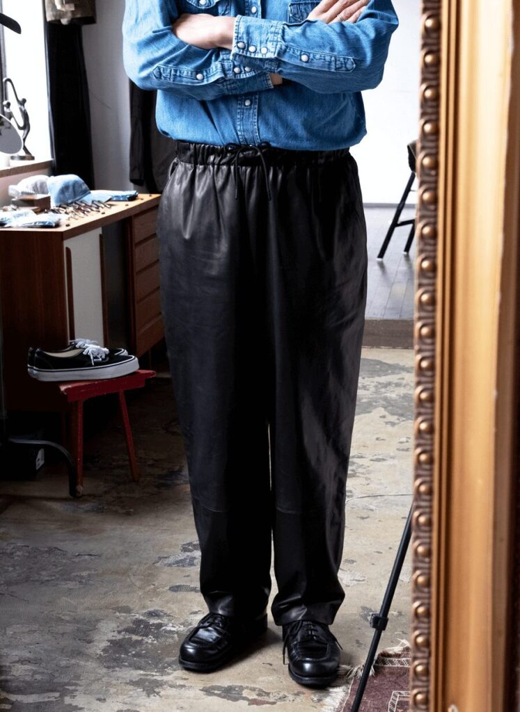 ワイドテーパードシルエットにドローコードを着けてラムレザーが生み出すリッチなドレープが魅惑するLeather Pant “Cooper”。